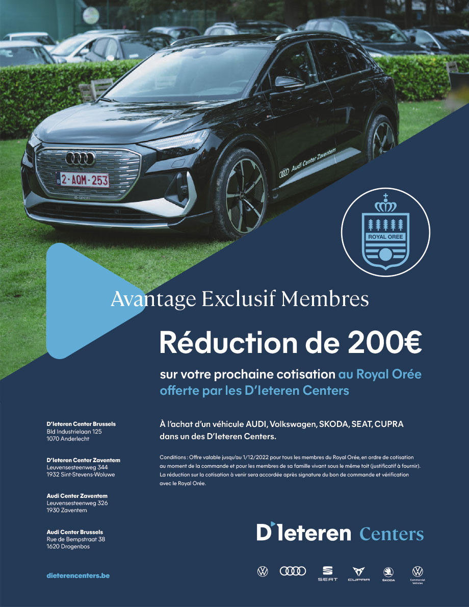 À l’achat d’un véhicule Audi, Volkswagen, Skoda, Seat ou Cupra, les D’Ieteren Centers vous offtent une réduction de 200€ sur votre prochaine cotisation au Royal Orée.