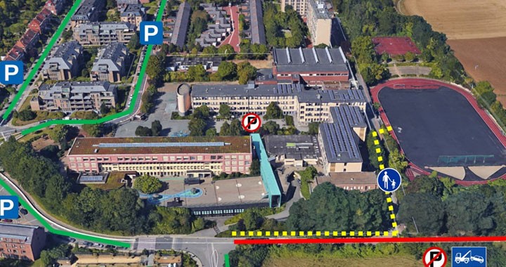 Pas de parking à l’intérieur de l’école. Merci de stationner votre véhicule aux endroits autorisés aux alentours. Le parking est interdit sur la seconde partie de la Kleinenberg, il y a des contrôles de police réguliers! Parking autorisé sur la première partie de la Kleinenberg et sur la Sasstraat, il vous faudra ensuite rejoindre le terrain situé dans l’enceinte de l’école à pied.