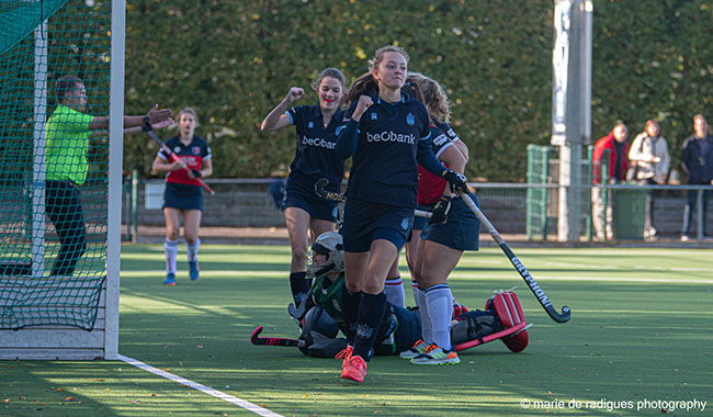 La seconde mi-temps démarre sur les chapeaux de roue avec un magnifique une-deux au milieu de terrain entre Astrid et Ophélie, qui voit Clara Van Espen en bord de cercle. Seule face à la gardienne, elle parvient à la mettre hors coup en décalant la balle vers la gauche mais le shoot de revers passe au dessus de la cage. Les spectateurs ne peuvent s’empêcher de libérer un cri de désarroi. Et une tournée générale, s’il-vous-plaît! Heureusement, Clara ne la paiera pas toute seule. Ophélie Vincent récupère une balle dans l’hypothétique rond central et part seule vers la gardienne adverse. Petit décalage vers la gauche comme sur la phase précédente, shoot de revers vers le goal vide… et c’est cette fois la transversale qui empêche la balle de s’abîmer dans les filets. Les actions s’enchaînent mais le marquoir reste figé. Un beau travail de dribbles le long de la ligne de fond, effectué par Astrid Bonami, fait atterrir la balle dans le stick de Noa de Kerchove qui ne se fait pas prier pour la glisser au fond du goal (4-0). Hélène Delva écarte une à une les Brugeoises pour se créer un espace de tir en bord de cercle mais le shoot de coup droit n’est pas assez puissant pour inquiéter la keeper. Une montée sur le flanc gauche de Valentine Jonet, toute auréolée de sa nouvelle «marrainité», sert Claire Barry dont le shoot de revers passe à coté du piquet opposé. Une passe d’Ophélie Vincent arrive à Hélène Delva en bord de cercle, qui d’un petit crochet écarte son adversaire pour atteindre Claire Barry sur la droite du cercle. Claire tente sa chance d’un angle jugé «difficile» pour les spectateurs. L’audace est payante et Claire signe le cinquième goal de la rencontre (5-0). Par une balle puissante qui traverse tout le terrain, Nahia Balon-Perin trouve Clara Van Espen sur la ligne de fond. Le centre de Clara est dévié dans le goal, mais malheureusement par un pied adverse.