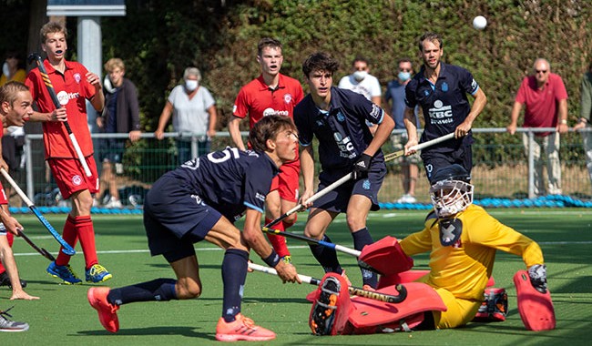 Quatrième quart-temps (11-0). 61e, Quentin Moens, attentif devant le but namurois, pousse la balle au fond du but et inscrit son premier but en DH (9-0). 65e, Max Branicki obtient un second stroke que Tomi Domene transforme (10-0). 67e, belle passe de Stanislas Branicki à Facu Callioni qui centre, Max Branicki est à la réception, but (11-0). Score final. Nos Bleus ont montré du collectif, de la discipline et une organisation. Rendons hommage aux Namurois qui n’ont jamais baissé les bras avec leur équipe jeune et inexpérimentée.