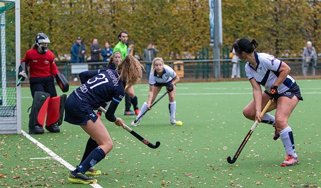 Les deux buts suivants arrivent coup sur coup. Les spectateurs qui ont quitté le terrain pour quelques minutes s’en mordent les doigts. Ophélie Vincent récupère une balle au centre du terrain et voit Claire Barry légèrement décalée à droite du goal qu’elle atteint d’un long shoot de revers. Petit crochet de Claire pour mettre la gardienne à distance et shoot en revers dans le coin opposé (2-0). Le troisième goal est un goal à angle droit. Claire Barry, stick au sol, récupère la balle sur la ligne des 25, petit revers pour mettre l’adversaire dans le vent et passe horizontale (à la ligne) sur Ophélie Vincent qui joue verticalement la balle cette fois vers le goal. Clara Van Espen surprend le Parc par une reprise de volée dans le coin gauche. (3-0)
