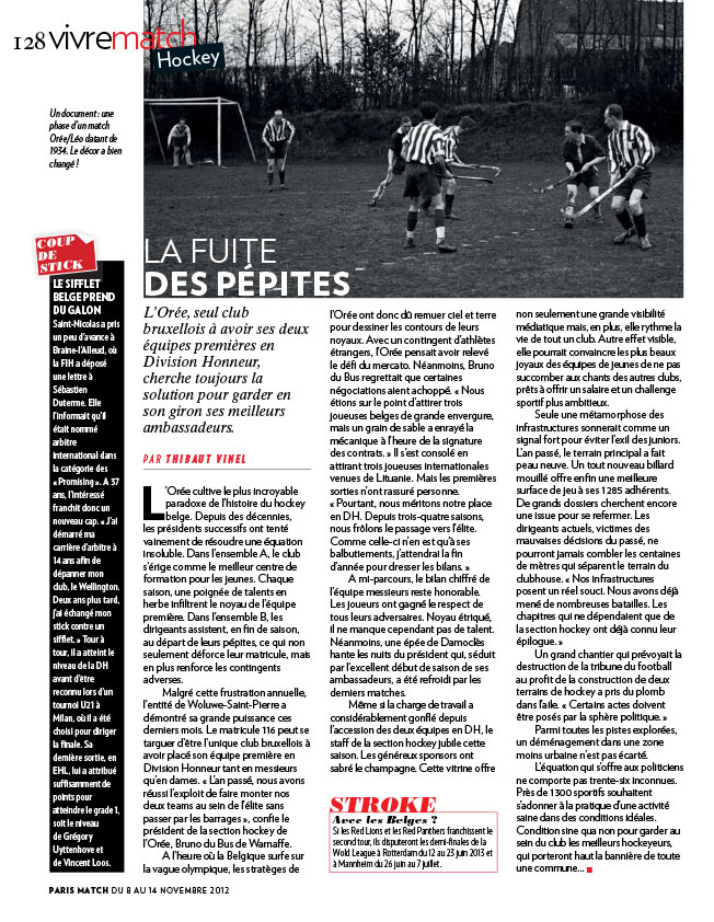 L’édition de Paris Match Belgique du 8 novembre consacre un article à l’Orée intitulé La fuite des pépites, illustré d’une photo collector d’un match Orée-Léo datant de 1934! L’Orée, seul club bruxellois à avoir ses deux équipes premières en Division Honneur, cherche toujours la solution pour garder en son giron ses meilleurs ambassadeurs. Téléchargez l’intégralité de cet article en PDF (236k) et merci à la rédaction de Paris Match de nous avoir fait parvenir la version PDF.