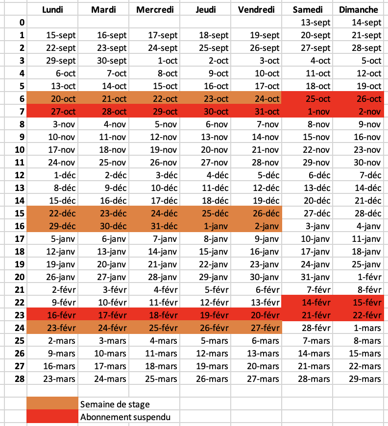 Du 25 octobre au 2 novembre 2025 se déroulera un tournoi hiver et votre abonnement sera suspendu durant cest 9 jours. Cette semaine de suspension a été prise en compte dans le calcul du prix de l’abonnement.